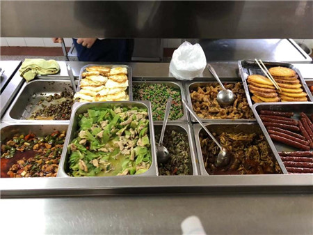 在各种食材大幅涨价的情况下,食堂依旧保持原来定价,青笋炒肉、豌豆肉末、煎荷包蛋、泡椒鱿鱼……,各类菜品一应俱全。