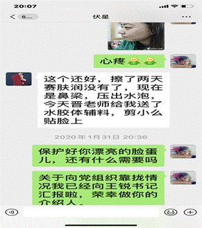 1月25日,第一例患者收住我院隔离病区。接到通知时,伏星还来不及跟家里人见上一面,就从科室匆匆赶往病区,在隔离区里每一天的工作都很紧凑,治疗、打扫、清洁、消毒、心理疏导……战友们都叫她勤劳的小蜜蜂。看到她因为长期佩戴口罩、护目镜,穿防护服产生的勒痕和皮肤损伤照片后,让我们十分的心疼。她本人却不在乎的说:"脸上的还好,擦了两天赛肤润就好了,现在是鼻梁,压出水泡,今天胃肠外科的晋文洁老师给我送了水胶体辅料,剪小贴脸上,没事的,过几天就好了。",她总是那么乐观,用乐观的情绪扫除病区里的阴霾。