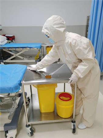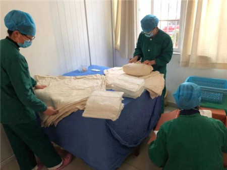 新冠肺炎发生后,预防和消杀成为疫情防控的重点。无菌包、自制防护服就是发热门诊、发热病人留观隔离区、急诊外科等科室作战的"枪支弹药"。当我院收治第1例新冠肺炎的患者后,为了提前做好应对措施,我院消毒供应中心根据国家发布的相关规范制订了《玉溪市人民医院新型冠状病毒感染消毒供应中心复用器械处理流程》并通过科室微信群进行员工培训,及时与隔离病房工作人员沟通,取得配合。同时,由于医院防护服紧缺,科室积极配合质控部完成了400余件防护服的灭菌处理工作,为隔离病区、发热门诊提供临时物品运送服务20余次。
