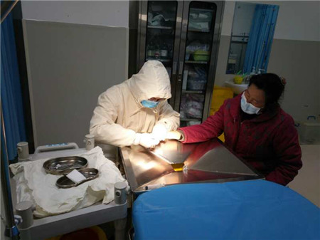 1月26日,科内护士纷纷主动报名向医院领导请战到隔离病房去工作,全科23名护士,20名签下请战书。急诊外科门诊属于高风险区域,尽管如此,科室成员每个人都默默的守好自己的岗位,没有一个因为担心而退缩,他们每天认真登记并排查就诊患者及家属,与医生一起分析患者病症并按时上报,每处理完一位患者,均要严格对清创室及诊室进行物表消毒,并对包括病区走廊在内的所有物品每日消毒两次。为节省防护用品,所有当班的医务人员只有需要进入病房护理患者的护士才可以穿一次性隔离衣。