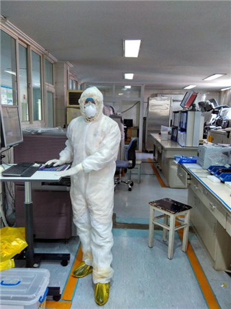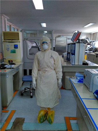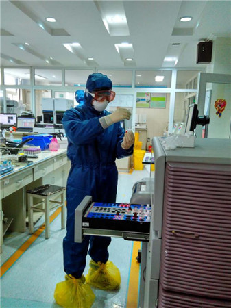 在我院原急诊楼二楼"发热病人隔离留观第二病区"楼上,同样是检验科的阵地,这里每天同样灯火通明,既承担全院的急诊检验工作,又承担发热门诊的检验工作,他们不惧危险,迎难而上,"保证完成任务"是他们郑重的承诺。他们极少言语,一张张快速而准确的报告单就是他们最好的语言。