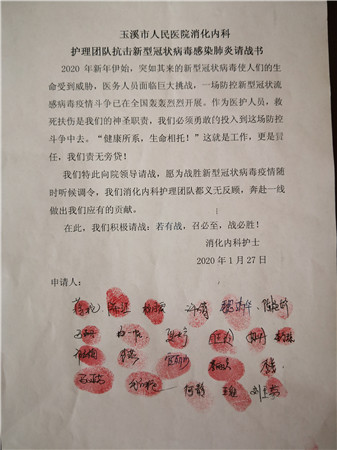 消化内科全科医护人员以高度的热情支援疫情救治一线工作,科室主动上报1名重症专科护士到新冠肺炎应急护理小组待命,并派出杨燕敏医师到发热留观病区、施强医师到急诊内科支援工作。全科除了住在隔离小区或疑似疫情区按要求需居家隔离的医护人员外无一人退缩,1月27日,全科包括孕妇和哺乳期妈妈在内的22名护士和共产党员积极提交了请战书,并在请战书庄严地按下手印。