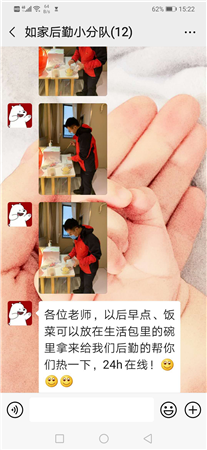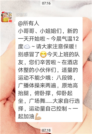 感动无时无刻不在,来自于玉溪市人民医院的沙彦春每天总会在群里提醒"小哥哥、小姐姐们,新的一天开始啦~今晨气温12度~请大家注意保暖,别感冒了!今天上班的队友,您们辛苦啦~在酒店休整的小伙伴们,适量的运动不能少哦:八段锦,广播体操来两遍,原地高抬腿,俯卧撑,仰卧起坐,广场舞……大家自行选择,运动量自己控制~一起加油"让大家心暖不已。后勤的小分队也十分的给力,不管是有任何的问题,他们总能在第一时间解决,让战友随时吃到可口的饭菜,后勤组的组长赵龙说我们24h随时在线,让大伙无任何的后顾之忧!群里的总有那么一些心细的战友,把自己能想到的小技巧、小经验或者一些注意事项发给大家,让大家能相互学习、相互提高、相互分享。有时候一句简单的问候能让你少绕路或者减少感染的风险。感控的小伙制定了严密的管理方案和排班管理,把驻地的感控做得一丝不苟,一个点一个点地实地侦查,决不放过每一个漏洞。战友之间从一开始的不认识到现在的互勉互助,每天相互加油鼓劲,互相吐露内心最真实的想法,我想这份战区的"战友情"和经历以后将会是我们一辈子的回忆。