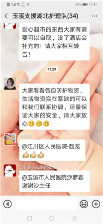 每天早晨醒来,在玉溪市人民医院的群里总能看见童副院长发来的问候,蔡副、李主任、陈主任每天在群里嘘寒问暖,一直提醒我们早点休息,保持充足的体力,每天时刻关注着我们的动态。只要我们有任何问题,马上第一时间帮我们解决。曾院长也打来电话,问候大家的生活及工作情况。卫健委的各级领导也很关心大家的工作衣食住行及工作动态,每天主动关注大家的身体及各方面的问题。玉溪市总工会及各级政府单位给了我们充足的保障,让大家对后方的家庭无任何的后顾之忧。虽然我们远在千里之外的武汉,可心却是近的。天冷心暖,玉溪市曾敏副市长发来慰问的短信,让大家感动不已。虽然武汉的天气很寒冷,可是我们的心里一点都不冷,在这里,各级领导的时时关心、刻刻关怀、战友的倾情互助、朋友的殷殷期盼,让我们一点都不孤单,我们不是一个人在上战场,我们是一群人在奋斗,不论是前线还是家庭都给了我们最坚实的保障,你们是我们坚强的后盾,后方的坚守及暖心是我们勇往直前的动力,请领导们放心,你们的殷殷期盼和牵挂是我们勇敢前行的动力,我们一定为打赢疫情战倾尽全力,不负重托!