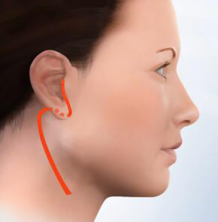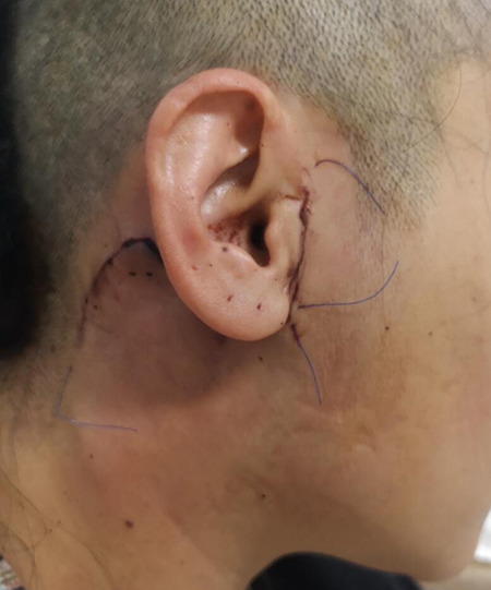 为了解决这个问题,从2017年开始,玉溪市人民医院耳鼻喉科将面部除皱切口进行改良,应用到腮腺肿瘤切除手术中,不仅规避了上颈部弧形的可视切口,而且又将耳后发际切口段隐匿于耳廓后方和枕乳部发际之内。这样一来,耳前的疤痕隐藏在耳内部,耳后的疤痕被耳廓遮挡住,发际内的切口在患者头发长出后,被头发完全遮盖,可以真正达到疤痕的“隐形”。
