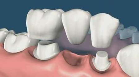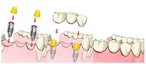 牙列缺损或缺失的传统修复方法可分为固定义齿修复(图2)和活动义齿修复(图3)两种。种植义齿修复属于固定修复,是近30年来逐渐发展起来的一种新的修复方法。种植牙提升咀嚼效率,传统固定义齿须将缺牙区两侧的牙齿(至少两颗)磨小一圈来做基牙,修复的义齿才会牢固,而缺牙区两侧的牙齿往往都是健康的牙齿,牙齿硬组织被磨除,有时还不得不进行根管治疗,给牙齿造成不可逆的损伤;活动义齿虽然几乎不磨牙齿,但要通过很大基托及卡环来固定义齿,影响美观,异物感强且咀嚼效率也相对较低。种植牙与传统义齿相比,具有以下优点:可少磨或不磨缺隙两侧的健康牙齿;固位及稳定性强,异物感小,美观,咀嚼效率能达到真牙的60%—90%;对于游离端缺牙患者,使用传统修复方法无法达到理想效果,此时口腔种植牙更具优越性。