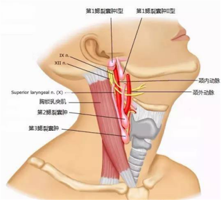 从鳃裂畸形的形成原因上我们不难看出,鳃裂畸形的病灶与相邻鳃弓或咽囊来源的腺体、神经和器官之间存在着极其密切的解剖关系。且鳃裂囊肿或瘘管的内壁衬覆源于鳃裂外胚层的复层鳞状上皮(约占90%),或源于咽囊内胚层的假复层纤毛柱状上皮,假如不彻底清除所有上皮,势必复发。