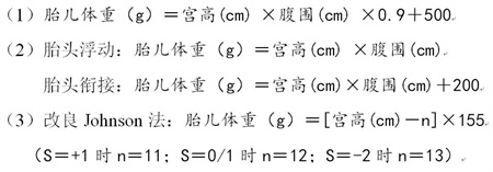 根据临床检查数据估体重,产科医师通过腹部触诊,测量孕妇子宫高度和腹围,根据临床经验总结了一些简便易行的计算公式估计胎儿体重,常用的公式如下: