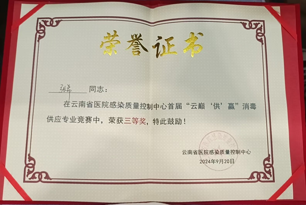 金秋时节,收获满满!2024年9月20日,我院消毒供应中心护士张希在云南省医院感染质量控制中心举办的“云巅‘供’赢”消毒供应“不良事件案列分析”竞赛中荣获三等奖。