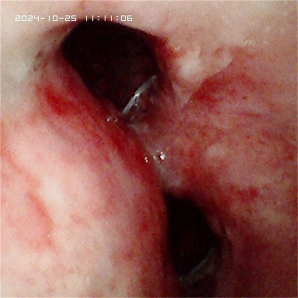呼吸与危重症医学科主任张继华调阅患者胸部CT,发现纵膈巨大肿块严重压迫左、右主支气管导致严重大气道狭窄,入院当天即行支气管镜检查证实患者左、右主支气管肿瘤侵犯生长并严重外压性狭窄,几乎完全闭塞,仅存“一线天”!