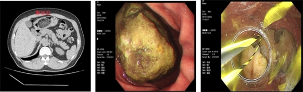 另一位61岁大叔,因胃疼到急诊科就诊,CT提示胃结石,无法通过肠道排出,金医生会诊查看病人无明显梗阻症状,暂时不需要紧急手术,联系了消化内科主任李林辉医生,为患者进行了胃镜下碎石、排石。