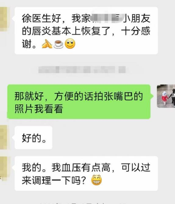 “徐医生,我家小朋友的唇炎好多了,谢谢你!顺便问一下,我血压有点高,可以过来调理一下吗?”