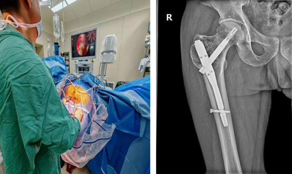 手术在全麻下开展,团队创新性采用关节镜辅助技术——通过关节镜的360°无死角视野,精准定位肿瘤病灶,借助专用器械彻底清除肿瘤组织;针对肿瘤较大导致的骨缺损,术中植入自体髂骨与人工骨混合骨材,并进行股骨近端内固定以恢复骨骼稳定性。