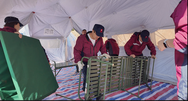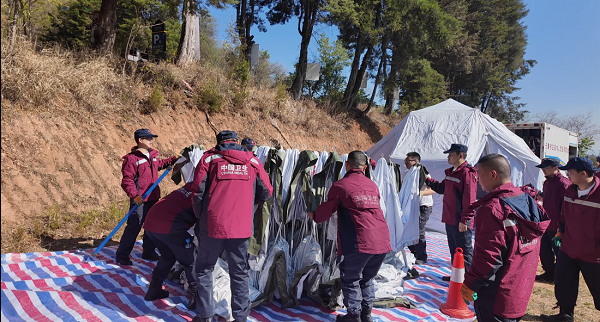 应急救援基地建设课目是演练重点之一。队员们因地制宜,依托龙马山自然地形,快速完成帐篷医院搭建、急救区域划分、生活区域布设,熟练掌握野外帐篷搭建、物资收纳装卸等实操技能,在无外部补给、无专业协助的情况下,高效构建临时救援保障阵地,充分彰显野外环境下的快速部署与自主保障能力。