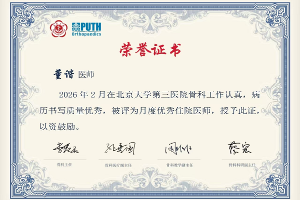 近日,北京大学第三医院向我院骨科医生董谐发来表扬信,并授予其“月度优秀住院医师”荣誉证书。这是对董谐医生专业素养的高度认可,也体现了两院脊柱外科协作的积极成果。